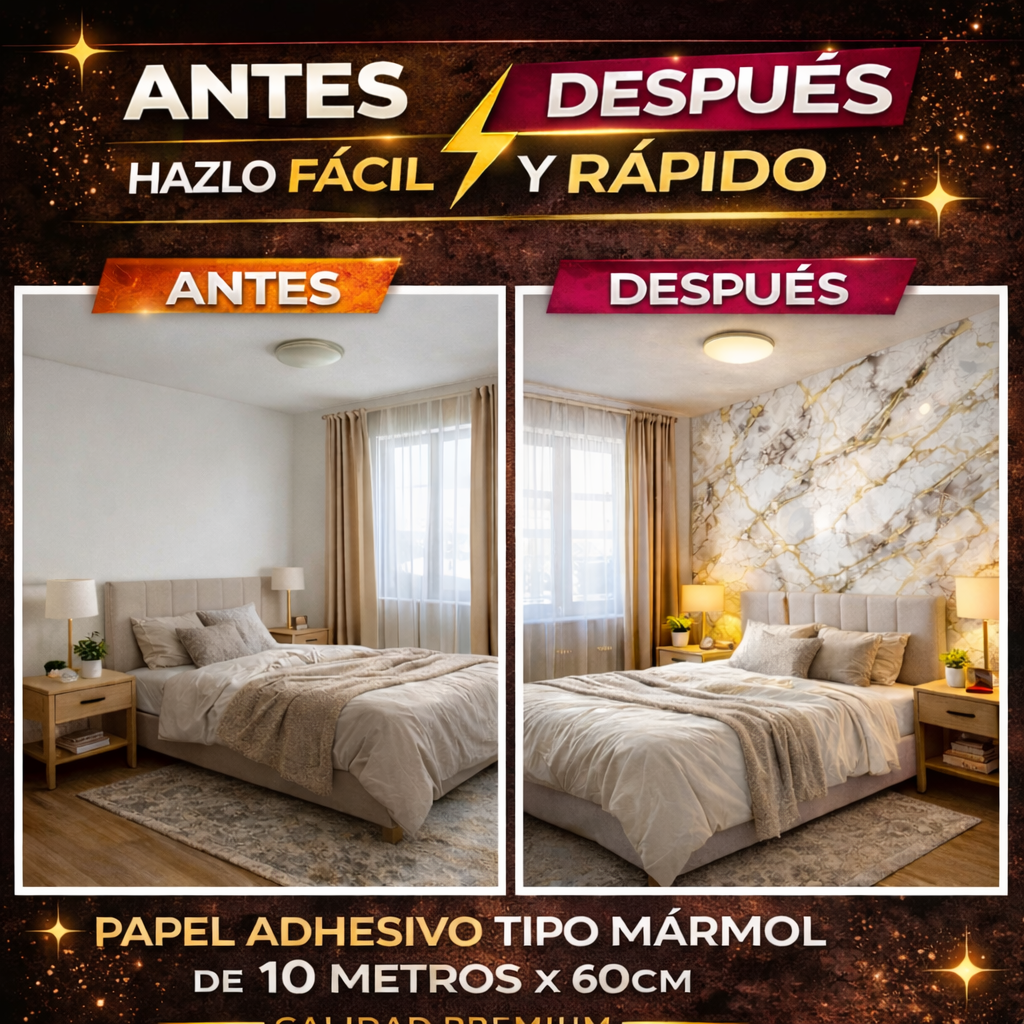 Papel Adhesivo decorativo para pared Medidas: 10 mts x 60 cm (ancho) por rollo Ideal para uso interior USOS:- No necesita pegante extra. Este papel adhesivo ya tiene su pegante extra fuerte.- Una manera rápida de decorar tus espacios- Instalación limpia y rápida- Producto económico para decorar El material tiene 60 centímetros de ancho por 10 metros de largo, en total el rollo cubre 6 metros cuadrados. Ideal para Interiores, Habitaciones, comedor, Baño, Cocina, sala, Cemento Se puede instalar en Paredes lisas, Cerámica, Drywall, MDF, Madera, Baldosa, Eterboard, Lisas, Muebles, Neveras, Papel tapiz, Pared pintada, Paredes, Paredes de cocina, Techos, Vidrios, Cocina, Zonas húmedas RECOMENDACIONES Limpiar la superficie antes de instalar, retirar una parte del papel protector de la parte posterior y continuar con la instalación.• No recomendado en paredes que tengan problemas de humedad u hongos.• Ideal que las paredes estén lo más lisas y niveladas posible.• Fácil de limpiar, idealmente con paños suaves y no muy húmedos.INSTALACIÓN:1. Verifique que la pared esta lo más lisa y limpia posible2. Retire el papel de protección para que el adhesivo quede expuesto3. Acomodar el papel sobre la superficie de la pared o muro y presionar
